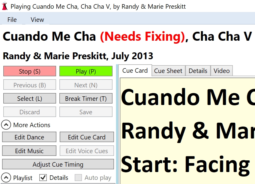 Marking cues as needing to be fixed can be done while the dance is playing in addition to when it is paused or stopped. This is very useful while cueing as you can mark the cue as needing to be fixed when you spot an issue instead of waiting until the end of the dance (and possibly forgetting what needs to be fixed).