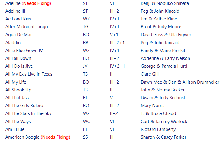 A list of dances that need fixing can be seen by clicking the Needs Fixing checkbox in the selection filter. See the Filtering section of the Selecting Dances topic for more information.